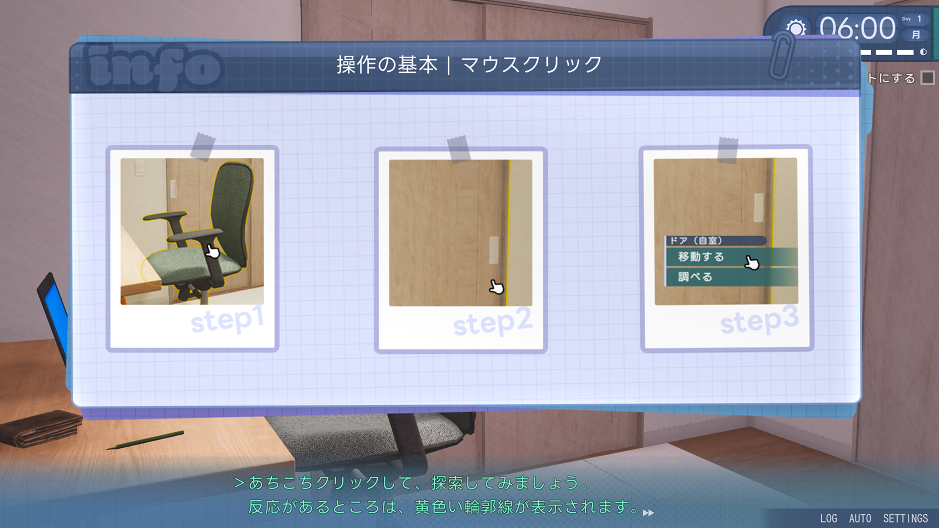 移動はFPSのような自由移動ではなく、ドアや椅子などオブジェクトをインタラクトする形で進行します。