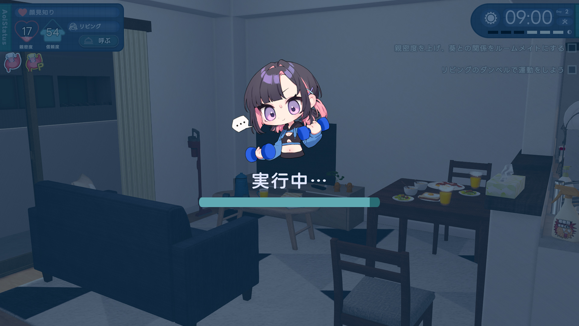 主人公の行動の裏で、アオイちゃんも常に行動しており、何をしているのかはステータスで確認できます。
