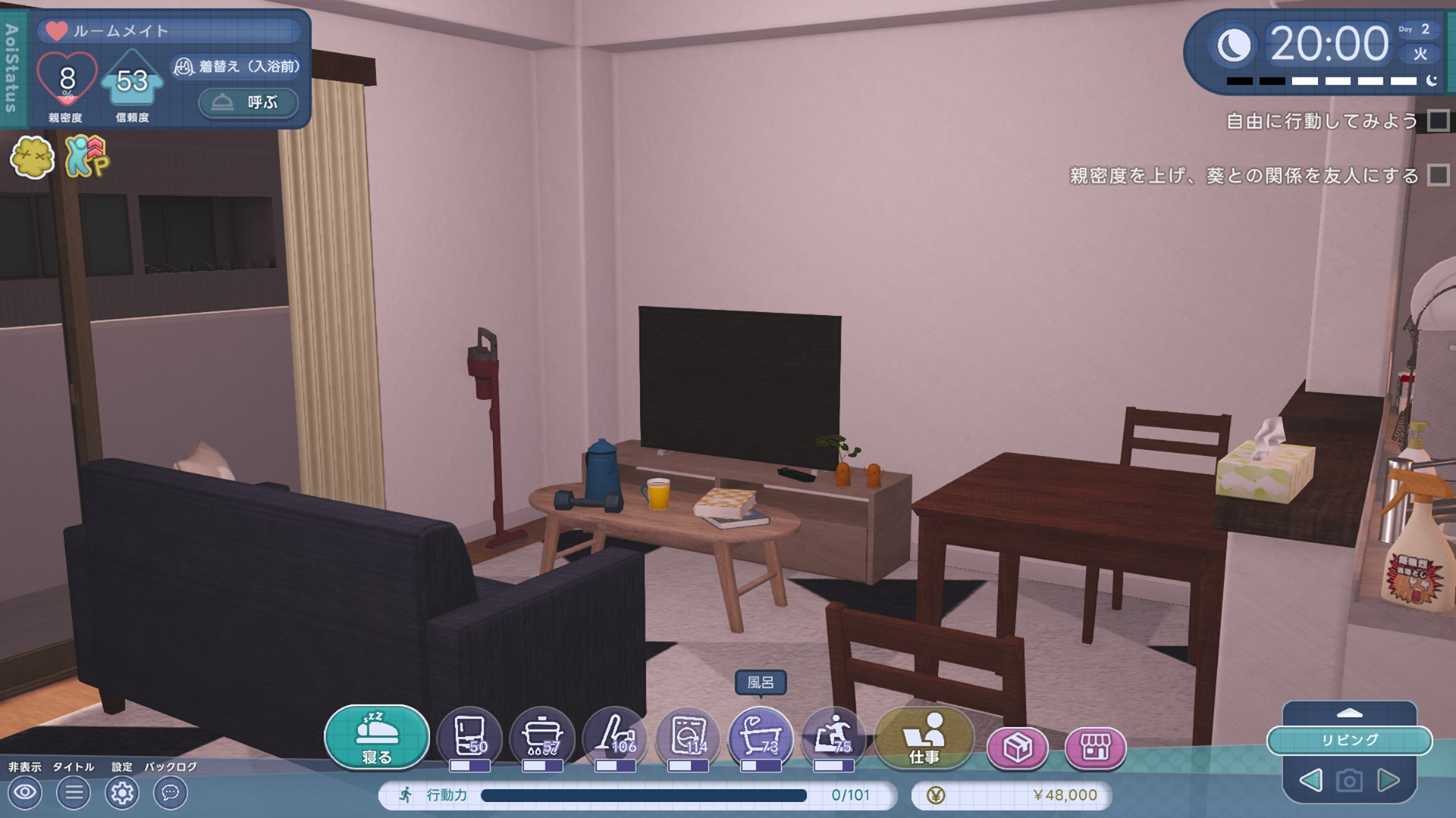 他にも「お金」「空腹」「不潔」といったステータスがあり、信頼をなくすことによるゲームオーバーもありますが、ゲーム的にそこまでシビアな要素は無いので、難しいことは考えず思いのままに行動していいと思います。